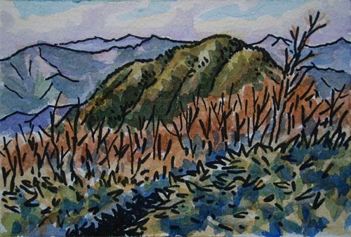 ふたつの山頂間を同行した地元静岡の方の話では、このあたりが南アルプス南部の展望地で、いつもこの辺で昼休みをするのだそうですが、残念ながらこの日は雲が掛かって見えませんでした。雲がなければ大谷嶺から山伏方向に見えるようです。