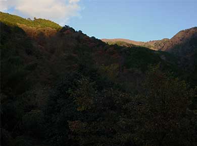 ↑下十枚山から十枚峠に戻る尾根道の途中からの北(右外)〜西(小無間山)側の眺め。