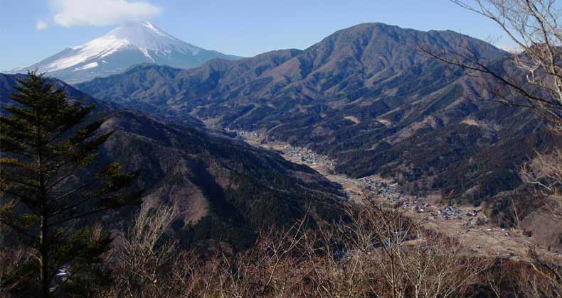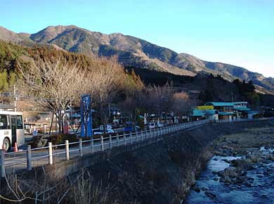 鳥ノ胸山は西丹沢の主稜線から北側に離れた、小さな独立峰といった山です。地図のルビは「とんのむねやま」ですが、「とりのむねやま」が正しいのだとか。 他の山とつながっていない小さな山で、ここだけでは物足りないためか一般の登山者は少ないのですが、下が大きなキャンプ場になっていて、首都圏からのボーイスカウトなどの団体がはいるので、その時期には結構歩く人が多そうです。 道志川の橋から見た出発点「道の駅どうし」と菜畑山方面→。 |