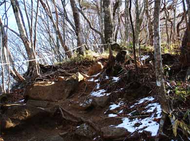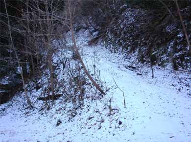 ↑入口にはっきりした道標が無いので、林道を遠回りすることになったようです。日陰には半月ほど前の雪が残っていました。 |