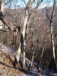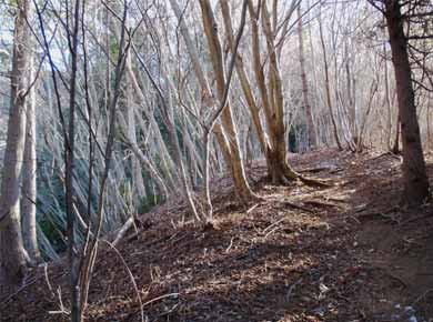 雑木や植林の混じった樹林の間から道の駅を見下ろしながらの急な登り道です。 |