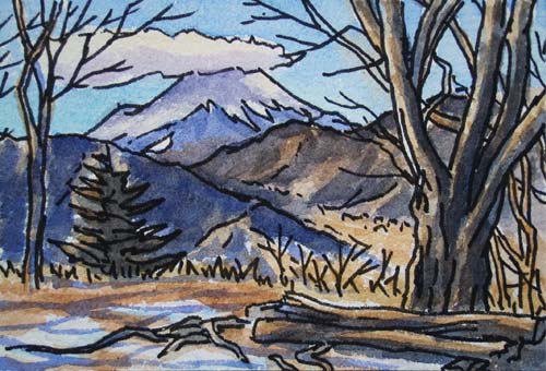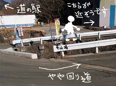 ↑山頂から西側に見える富士山と御正体山(みしょうたいさん)。この日、寒気がはいったせいか、富士山頂の雲は夕方までとれませんでした。御正体山の下に斜めに伸びる道は、山中湖に向かう道志道。道沿いに長い道志村が続きます。 |
