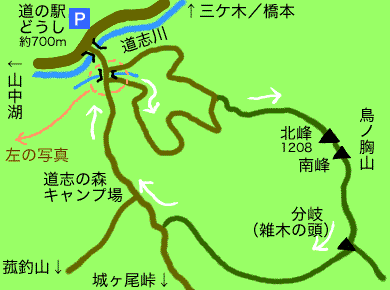 ↑キャンプ場経由で道の駅に戻る道と、「道志の湯」方面に下る道との分岐点。「雑木の頭」と書いた板が木に付いています。