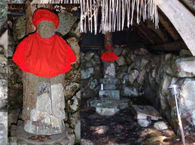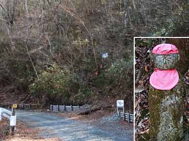 ↑地蔵峠の入口まで林道をしばらく歩きます。急な斜面を削ったらしく、あちこち崖が崩れています。入口の道標は、番号があるばかりで地蔵峠という名が無いので、わかりにくい感じです。↑登り口と、少し上にあるお地蔵様。 |