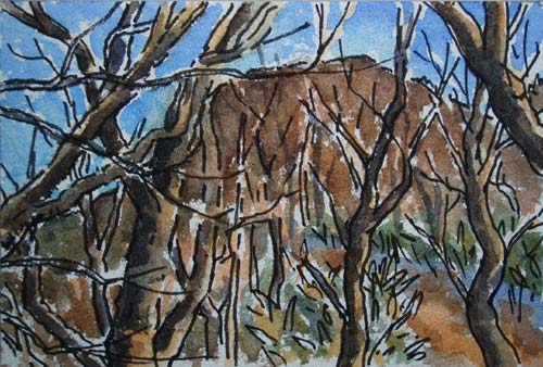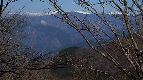 ↑雑木や植林の入り混じった道を登ります。↓枝越しに南アルプスの山頂が見えてくると↑地蔵峠に出ました。 |