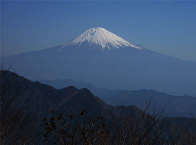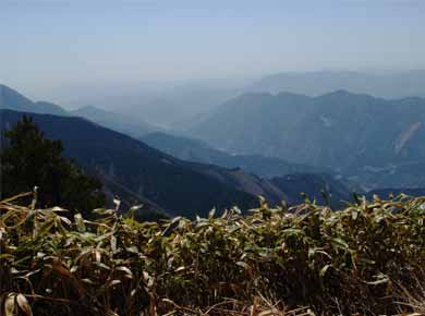 上の図の前は十枚山への尾根、後が青笹山方向になります。この辺はブナの木が多い所です ←安倍川の対岸に連なる尾根が南アルプスを隠しています。 中央部のゆるやかな高みは山伏(やんぶし)という変わった名前の山で、夏に、この辺では珍しいヤナギランの群落が見られるそうです。 |