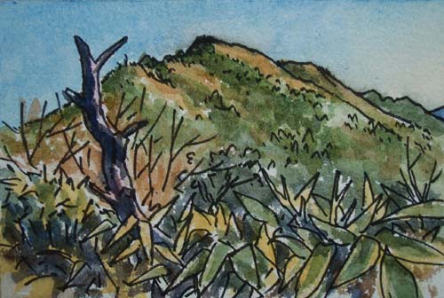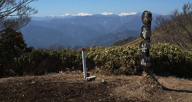 ←細島峠を過ぎしばらく登り道が続くとあたりが開けて青笹山が見えてきます。道標には左の高い所を「うつろぎ山」、右側を「青笹山」と書いてありますが、各山頂は 200mとは離れていないので、独立した山なら双耳峰といった感じです。 1/25000 地図ではふたつあわせて青笹山となっています。 |
