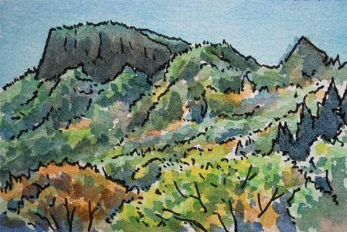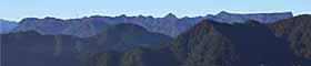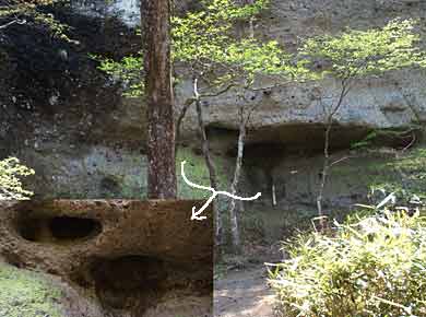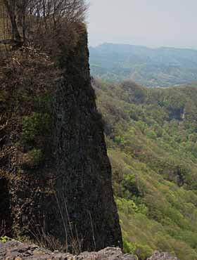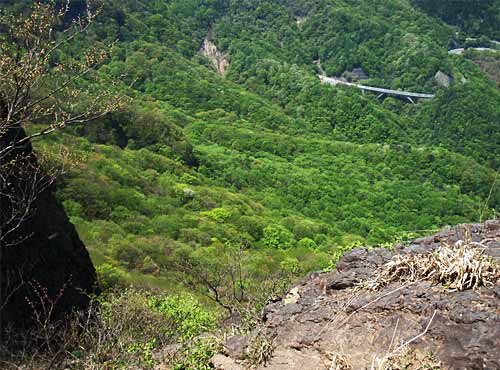 この辺の山は標高は低いのですが、妙義山など尖った形の山が多く、高みから見ると荒波の立つ海のように見えます。荒船山はその海を行く船に見立てた名前のようです。 ![]() ↑は妙義山からの眺めで、左側は別の山も組み合わさっているようですが、全体が軍艦のようにまとまって見えます。 右に進んで行くようにも見えますが、右端がトモ岩で船尾になるので、別の場所から見て名付けたのかも知れません。 登り口の内山峠下から見た艫岩→ |