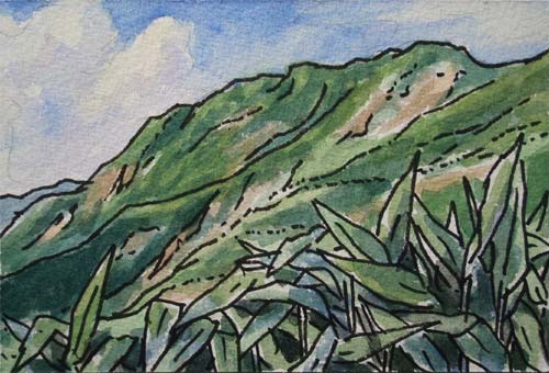 蓬峠から一段あがった所から振り返った眺め→。鍋底のような山(七つ小屋山)との間が蓬峠で、山小屋「蓬ヒュッテ」があります。 その左のマッターホルンのようなのは大源太山、その右手の遠くは巻機山(まきはたやま)のようです。 この辺の尾根は笹に埋め尽くされ、登山道の両脇近くにニッコウキスゲなどの花が見られます。 |