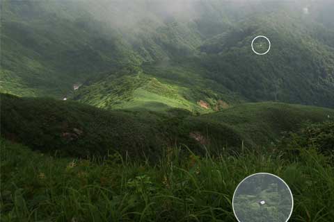 ![]() ←さすがは豪雪地帯で、まだ残っている雪渓を幾つか横切ります。 上中央部のたるみが蓬峠のようです。 |