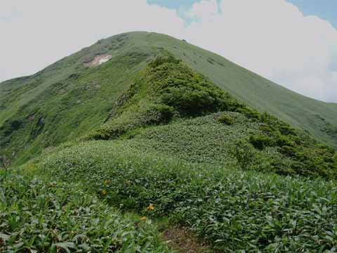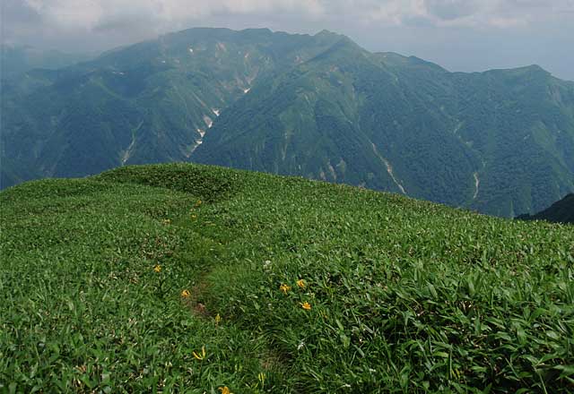 ![]() ↑一ノ倉岳あたりまで、笹原の尾根道によく見掛けたニッコウキスゲ。 武能岳への尾根とシシウド↑。 |