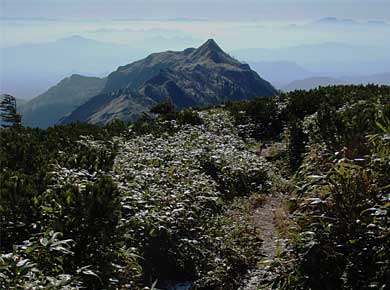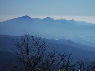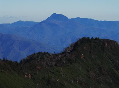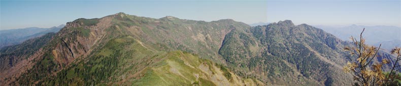↑ようやく着いた山頂。樹木はハイマツやシャクナゲなど低木で 360度の大展望でした。↑はるか南(中央やや右)に富士山も見えます。 |