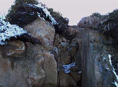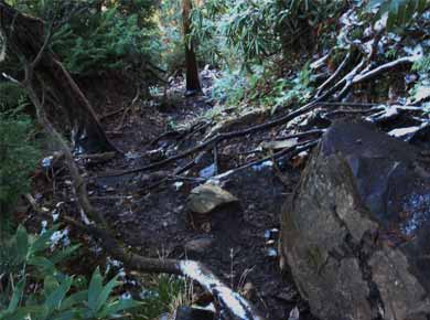 ↑西側の展望。気温が高いので谷川岳は1時間余りで雪が殆ど融けてしまいました。出発が遅れて昼過ぎに着いたので遠景は霞んでいますが、北アルプスらしい山も見えました。 |