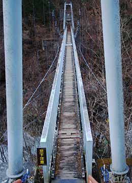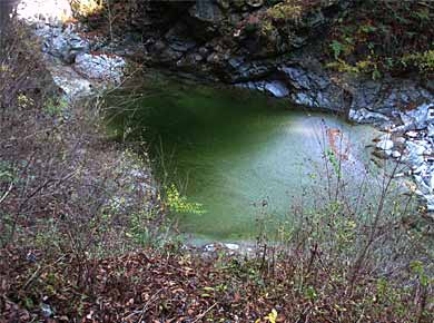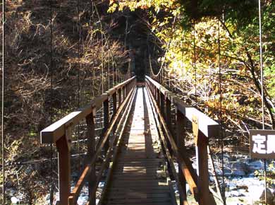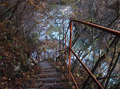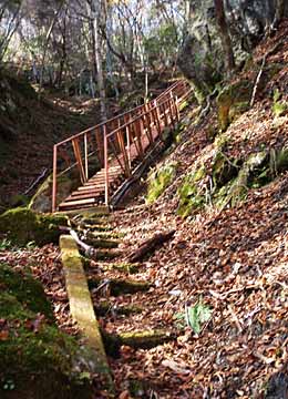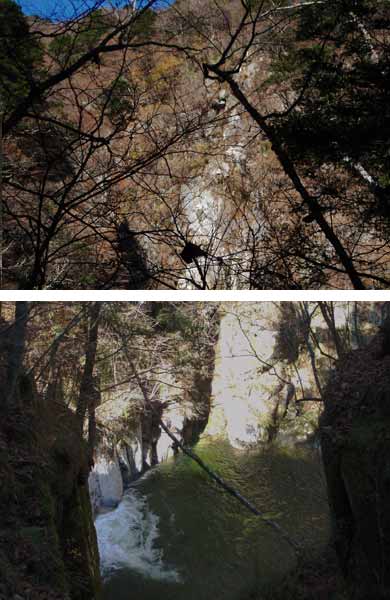 ![]() ↑渓谷の入口にキャンプ場などがあり、夏はキャンプや釣りで賑わうようで、頑丈な鉄製の桟道や階段が要所につけられています。上右は千ヶ渕という名札がありました。 |