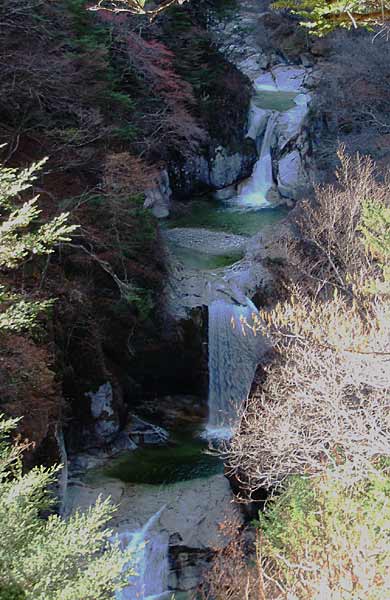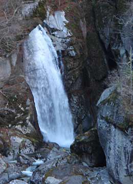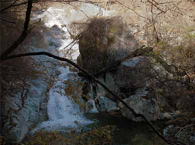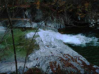 ![]() ↑一枚岩を渓流が越える所。も少し早ければ紅葉が見事だったようです。↑三の滝という小さな滝。 |