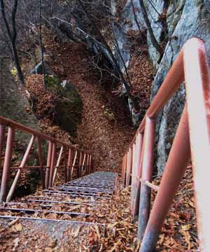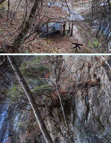 ![]() ↑二つ目の吊り橋でまた左岸(上流から見て左側)に移ります。遊歩道はここまでで、この先は沢登りのコースとなるようです。 上中は不動滝。ここから日向山の林道に上がるのですが、ハシゴや木の段の続く急斜面となりました↑。 |