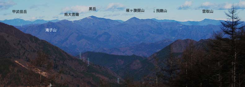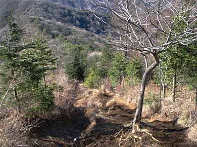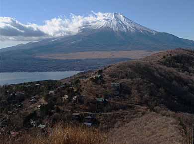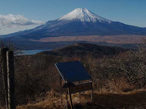 ![]() ↑神社から頂上は近いのですが、これまでの歩きやすい道から全くの山道に変わり、背丈くらいの段差が何か所かあり、木の根をよじ登る感じです。富士山を正面に見る山頂↑。明るく見えるすそ野は北富士演習場のカヤ原。 富士山頂の下に盛り上がっているのは、これから向かう大平山です。 |