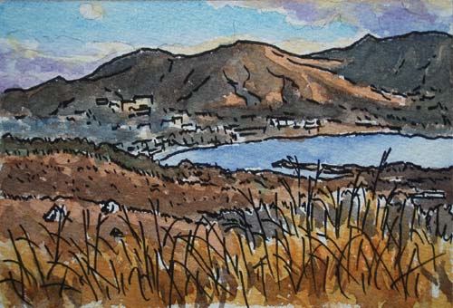 ゆるやかなススキの原を下り、林や別荘地の中を抜けて湖畔に出ました↓。