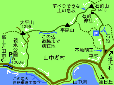 広い山頂のすぐ下まで、山中湖と忍野村から林道が上がってきています。