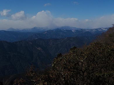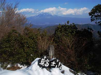 第一真富士山山頂→周りは樹林で東側が開けているだけですが、ここからの富士山の眺めは第一級です。 左端の木に白い板が吊ってありますが、12月にこの尾根の南隣「竜爪山」(りゅうそうざん)に登り、行方不明になった方の情報提供依頼でした。 両方ともハイキングの山なのですが、事故の予測は難しいものですね。 |