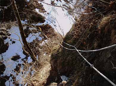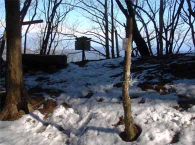 ![]() ↑登るほどに雪が増えてきます。上の人達は大阪方面から来られたそうで、名の知られていない山にしては遠方からという感じです。会話にこの辺の観光地や温泉の名前が出ていたので、観光を兼ねて歩いているようでした。 雪の急斜面を少し登ると山頂の下で、真冨士神社の祠があります↑。 |