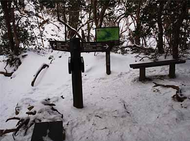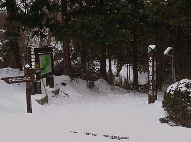三月の伊豆の山といえば、湯煙につつまれてツバキの咲く峠道を踊り子が越えて行く…といったイメージでしたが、車道の両側には除雪された雪が積み上がって、間違えて「雪国」の方を開いたのではないかと思うくらいでした。この冬は特に寒かったようで、例年二月には咲く川津桜も今ようやく見頃になって、桜祭りが延長されたとかニュースで聞きました。 登り口はゴルフ場の隣で、五月、シャクナゲの季節には広い駐車場はいっぱいになるそうですが、この日は静まりかえっていました。 |