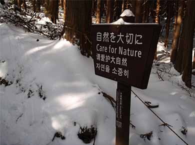 ![]() ↑駐車場から車道を越えた反対側の登り口。ここでさっそく軽アイゼンをつけることになりました。↑植物保護の国際的な表示。低い山ですが、もしかしてノーベル文学賞絡みで外国にも知られているのでしょうか。 |