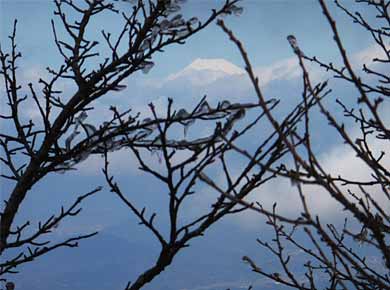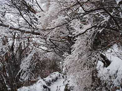 ![]() ↑林の中の分岐。左がこれから登る万二郎(ばんじろう)岳、右が戻ってくる道になります。↑この辺に多いヒメシャラなどの枝に氷がびっしりと付いて、常緑樹アセビの葉も氷漬けになっていました。 |