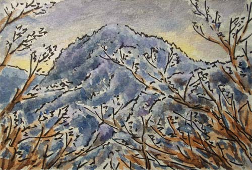![]() ↑万二郎岳山頂。樹林につつまれて狭く、見晴らしもありません。↑葉を落とした枝越しに覗く富士山。天気予報は晴れだったのですが、伊豆は雲が掛かって時おり小雪が舞ったりしています。 |