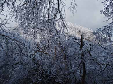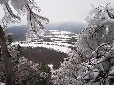 山頂を少し下りると樹林の切れた岩場があり、そこがこのコースでの展望ポイントと案内図にありましたが、雲のせいであまり見晴らしは利きません。←雪に包まれて寒そうな万三郎(ばんざぶろう)岳。 |