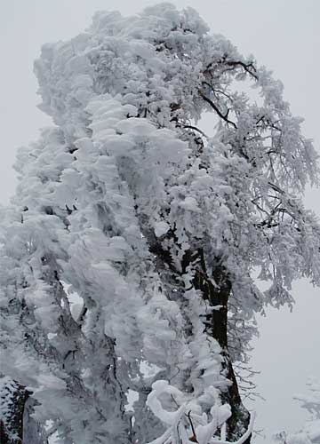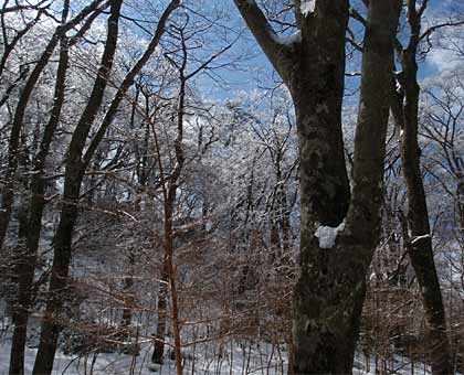 四月の中頃ならアセビの花の中を歩くことになるのでしょうが、今は葉が氷に覆われて、重くなった枝が道に垂れ下がり、くぐったり払いのけたりで道がはかどりません。
