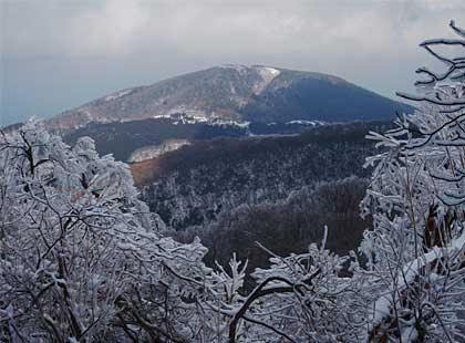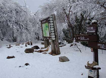 ↑登り口の天城高原ゴルフ場方面。だいぶ雪が積もっているようです。↑東側、相模灘方向。尾根上に風力発電の風車が見えます。右側の漁港らしいあたりは片瀬という地区のようです。