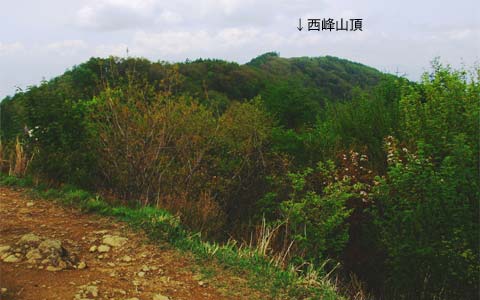 ホトトギス、カッコウ、ツツドリなどの声を聞きながら、ひと登りすると東峰山頂に出ました。→標柱に展望の名山とありましたが、このところ二か月ばかり雲の多い天気で、この日も周囲は雲に覆われて、隣の山くらいしか見えません。 天気がよければ南・中央・北アルプス、八ヶ岳など見えるそうです。 |