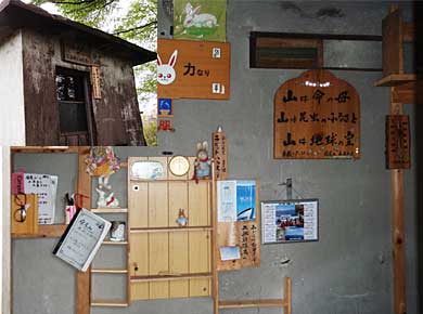 ![]() ↑無人の山小屋に並んで東屋といった壁のない建物もあり、この広場で五月連休頃、山開きのイベントがあるとの表示がありました。隣は「花の百名山」という看板。 |