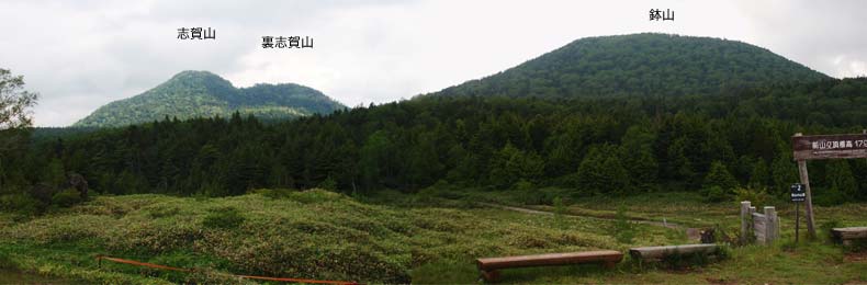 志賀高原は冬季オリンピックの開催地で、スキー場だらけといった感じです。入り口も「前山スキー場」で、ホテルの前のスキー用リフトが夏も動いていて、高さ 200mほどを座ったままで運んでもらいました→(山は笠ヶ岳)。 今年は五月頃からどんよりした天気が続きそのまま梅雨入りして、7月初め二日ばかり天気が持ちそうなので山歩に来たのですが、一日目はやはり曇り空でした。 ↓リフトの終点「前山湿原」。 右下から斜め左にのびる林道を志賀山、裏志賀山に向かいます。 |
