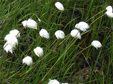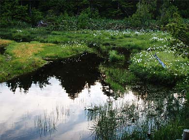 ![]() ↑歩き出すとすぐに渋池の脇を通ります。白く見えるのはワタスゲ↑で、アヤメの花も咲いていました。 食虫植物のモウセンゴケに覆われた浮島もあります。 標高は1800mですが、周囲に高山性のハイマツがあるのが、氷河時代の遺物として珍しいのだそうです。 |
