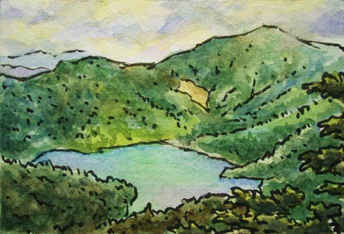 ↓赤石山山頂手前から見る大沼池。だいぶ雲がかかってきて展望はぼんやりしてきました。