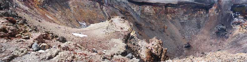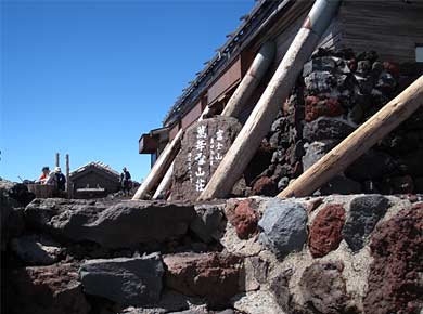九合目を見上げる→中ほど上に二本の柱が見えるあたりが九合目のようです。 この柱は元は鳥居だったのかもしれませんが、縦の裂け目が何本もあり、そこに硬貨(一円や五円が多いようです)がぎっしりと差し込んであるのが、ちょっと不気味な感じでした。 |