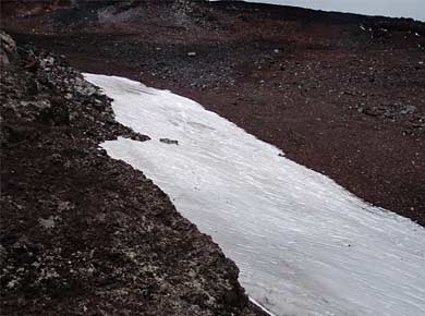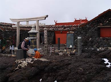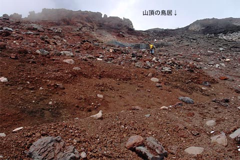 ![]() ↑八合目から見下ろす斜面。ロープは道を示すものですが、急斜面ではつい掴まりたくなります。↑八合目の鳥居。 |