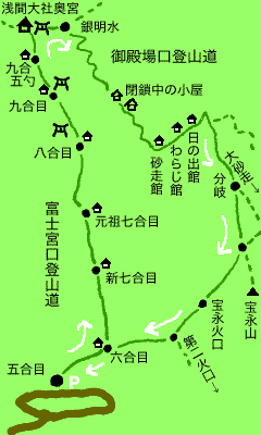 七合目下で御殿場口下山道「大砂走り」↑を分けて、宝永山↑の脇を廻り、富士宮口六合目に向かいます。