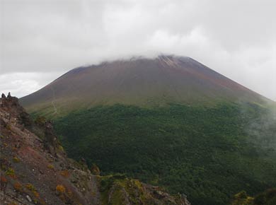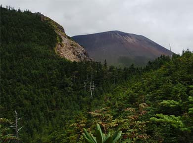 黒斑山・蛇骨岳(じゃこつだけ)は浅間山の外輪山といったものでしょうか、西側を取り巻く尾根にある浅間展望台といった山で、結構にぎわっていました。表示に依ると現在浅間山の噴火は穏やかになっていて、火口近くの前掛山まで行けるそうです。 北原白秋の詩のせいか浅間山にはカラマツ林が似合う感じですが、そんな林の中を登ります→。 ↓浅間山の反対側の眺め。 写真の右下に見える黒いケーブルは車坂峠から黒斑山の浅間山監視カメラにつながるもので、市役所などで映像が見られるそうです。 |