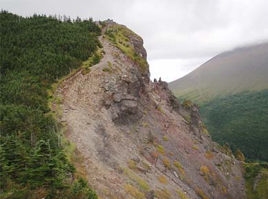 ![]() ↑「トーミの頭」というピークからの浅間山。この日は雲が多く、ちょうど浅間山頂あたりを次々と通過して行くので全体はなかなか見えません。黒斑山への道↑。火口側が切れ落ちて崖になっています。 |