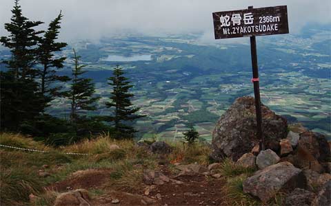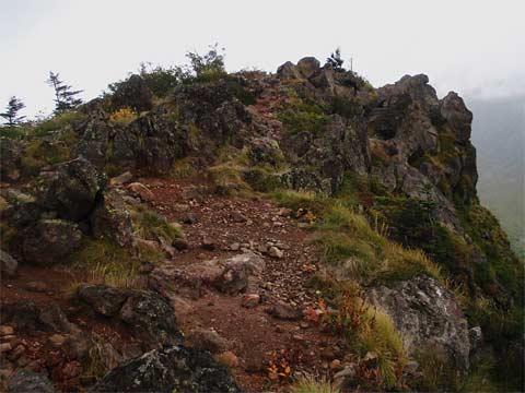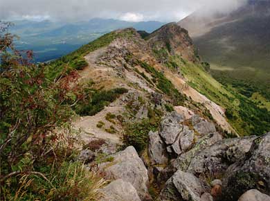 トーミは遠見のことかもしれません。岩のごつごつした高みで、正面に巨大な浅間山が見えます。 ←トーミの頭から見る黒斑山。 下左は黒斑山山頂。ここも岩だらけです。先に見えるのは蛇骨岳の先の仙人岳と鋸岳。 切り立った崖から見下ろすと、下はカラマツ林と草原でゴルフ場のようにも見えます↓。 一日のんびり浅間山を眺めて散歩でもしたらいい気分になれそうです。 |