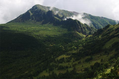 ![]() ↓火山性の土壌で水気の乏しい山ですが、外輪山の縁を廻って蛇骨岳へ向かう尾根道には何か所かぬかるみがあって、小鳥が水浴びをしていました。 |