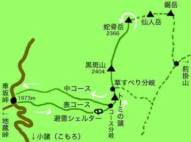 地図や標識に「Jバンド」という地名が出てきますが、左の鋸岳と浅間山の接合部がそんな形をしているので、この部分と思われます。右手、浅間山の山腹に見える細い筋は、前掛山への登山道のようです。 Jバンドを廻って火口原をトーミの頭へ戻るコースがあるのですが、時間の都合でここから引き返しました。 下左は黒斑山山頂下に立つ浅間山監視カメラと警報装置。 登山者などに噴火の危険を知らせる装置で小諸市役所で画像が見られるそうです。 トーミの頭から、登りにとった表コースに平行する北側の中コースを下りました↓。 |