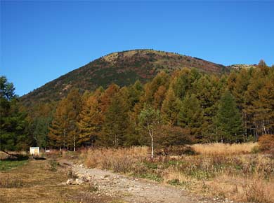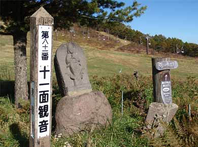 登り口の地蔵峠は長野県東御市(とうみし)と群馬県嬬恋村を結ぶ峠で、群馬県側の鹿沢温泉まで沿道に百体の観音像があるそうです→。六月、レンゲツツジが咲く頃がにぎわうようですが、登りやすいせいか十月中旬も人が多い山でした。 リフトも見えますがスキー用らしく、今は運休中です。 ↓入り口にあるキャンプ場から見る湯ノ丸山。 「○○の丘」といった感じです。 この辺の紅葉はまだ始まったばかりのようです。 |