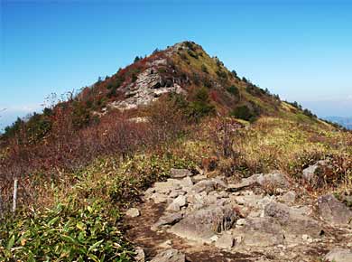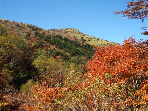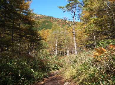 ↑ここから中腹のカラマツ林を廻って烏帽子岳との鞍部に向かいます。←鞍部から少し登ったあたりからの烏帽子岳。 ドウダンツツジやカエデの類などの紅葉がみごとでした。 |