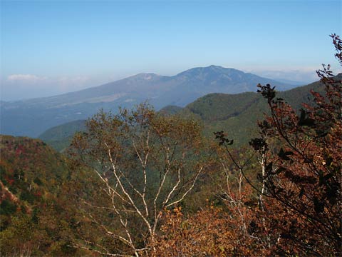 登り道から見る四阿山(あづまやさん/右)と根子岳→。鳥居峠を隔てて隣になります。 麓の菅平高原も、こちらの湯の丸高原もスキー場になっています。 |