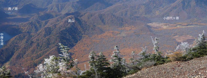 ↑山頂からの中禅寺湖。二年前の今頃、湖をひと廻りしたことを思い出しました。 |