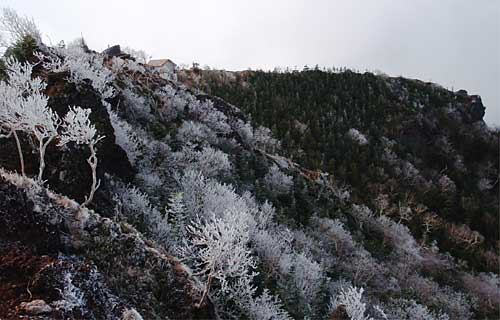 ![]() ↑八合目というあたりから霧氷というのでしょうか、氷をまとった樹林が見られるようになりました。 九合目で火口の上に出て、道はほぼ平らになります。九合目の標柱↑。 |
